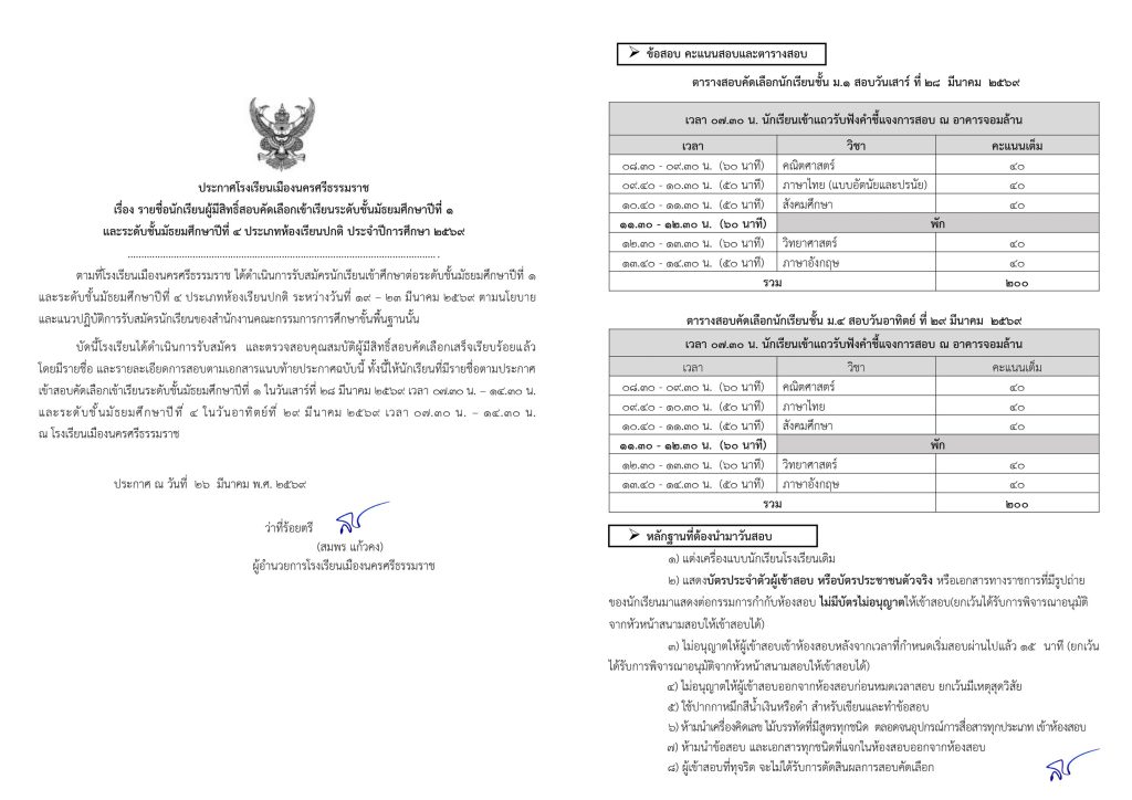 ข่าวรับสมัครนักเรียน ประกาศรายชื่อผู้มีสิทธิ์สอบเข้าศึกษาชั้นมัธยมศึกษาปีที่ 1และ ชั้นมัธยมศึกษาปีที่ 4 ประจำปีการศึกษา 2569 26/03/202626/03/2026 Admin 0 Comments ประกาศโรงเรียนเมืองนครศรีธรรมราชดาวน์โหลดรายชื่อผู้มีสิทธิ์สอบชั้นมัธยมศึกษาปีที่ 1ดาวน์โหลดรายชื่อผู้มีสิทธิ์สอบชั้นมัธยมศึกษาปีที่ 4ดาวน์โหลด